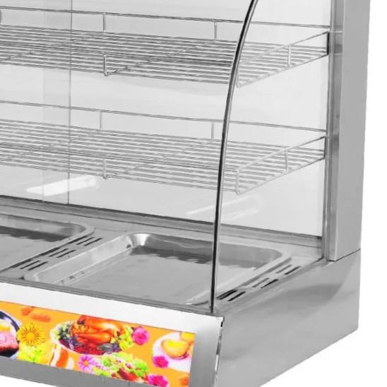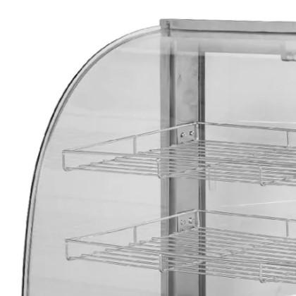 EXHIBIDOR CALEFACCIONADO PARA MANTENER ALIMENTOS CALIENTES. REGULADOR DE TEMPERATURA HASTA 80潞C. VOLTAJE 220V. POTENCIA 1200W. 3 NIVELES DE EXHIBICI脫N CON 3 BANDEJAS INFERIORES Y 2 ESTANTES REJILLAS SUPERIORES. ESTRUCTURA ACERO INOXIDABLE Y LATERALES VIDRIO. MEDIDAS: FRENTE 95, FONDO 45, ALTURA 63 CM