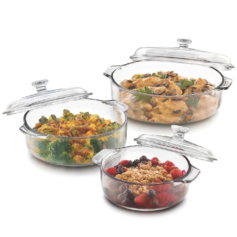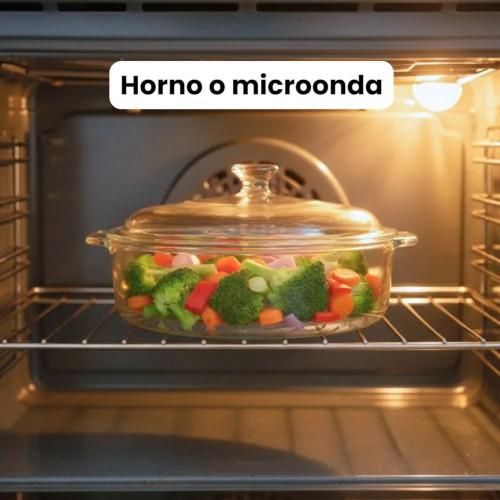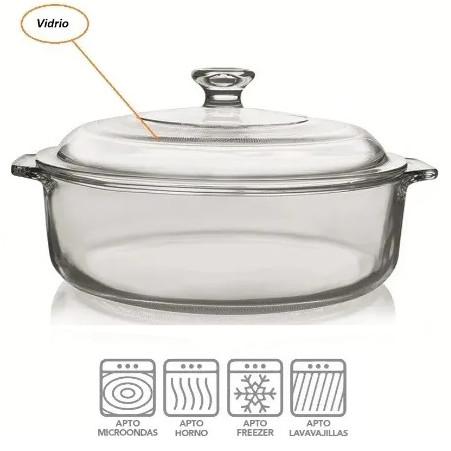 Vidrio templado, apto horno a gas, horno eléctrico, microondas, lavavajillas y freezer. PRECAUCION: evitar el choque térmico. No llevar directo de freezer a horno, o viceversa. Al sacar del horno, apoyar sobre madera, tela, o plástico, evitando apoya r sobre mármol o superficies frÃas. Al cocinar sobre llama directa, colocar agua y alimentos frÃos luego calentar lentamente, evitando choque térmico.